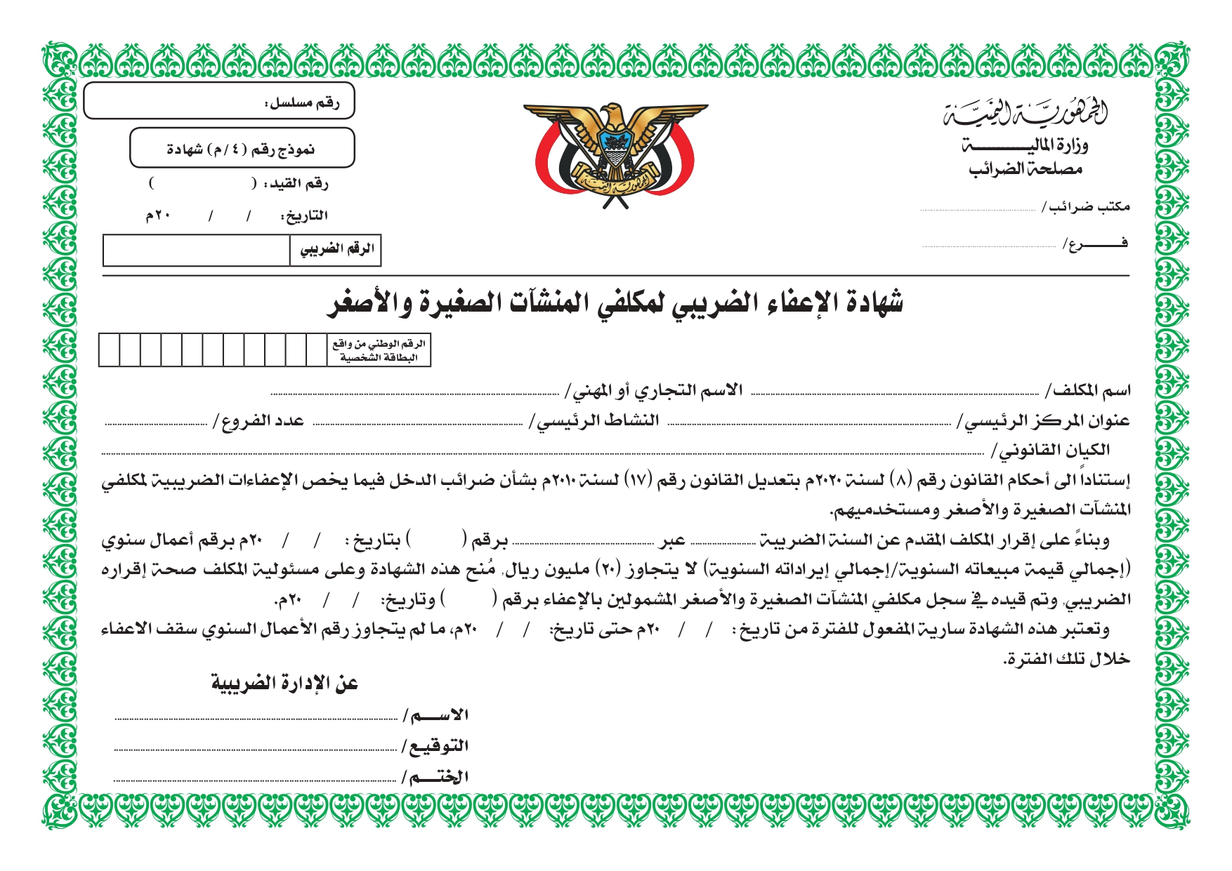 (2-1) في حالة أن صغار المكلفين بدأوا مزاولة النشاط في بداية عام 2020م يقوم المكلف بتقديم الاقرار خلال الفترة (يناير/ابريل) من السنة التالية (2021م) عن السنة الضريبية ( 2020م) التي بدأ فيها مزاولة النشاط ، وهكذا بالنسبة لصغار المكلفين المشمولين بالإعفاء الذين بدأوا مزاولة نشاطهم في بداية أي سنة لاحقة لعام 2020م.